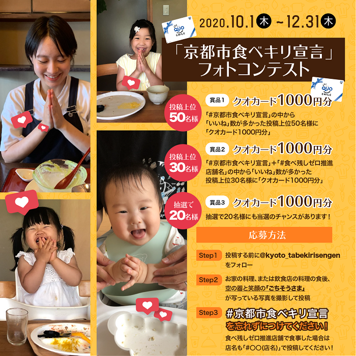 【募集期間:令和2年10月1日(木)~12月31日(木)】「京都市食べキリ宣言」フォトコンテスト開催中「ごちそうさま♪」の笑顔をインスタグラムに投稿