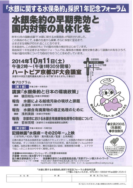 [コンシューマーズ京都]10月11日開催 「水銀に関する水俣条約」採択1年記念フォーラム 水銀条約の早期発効と国内対策の具体化を