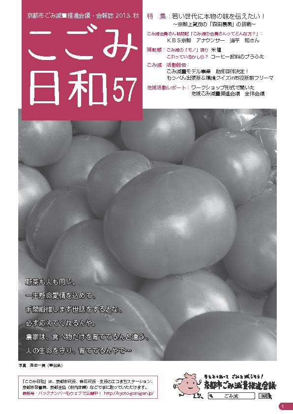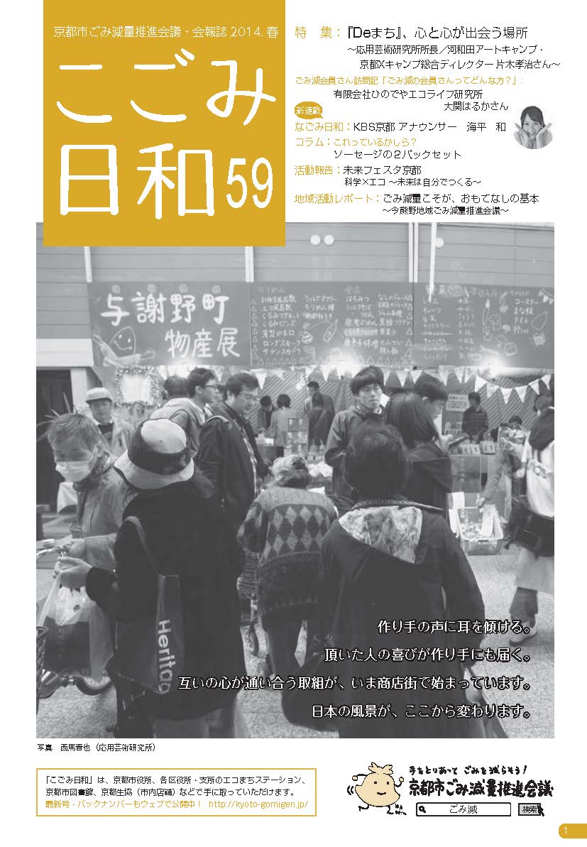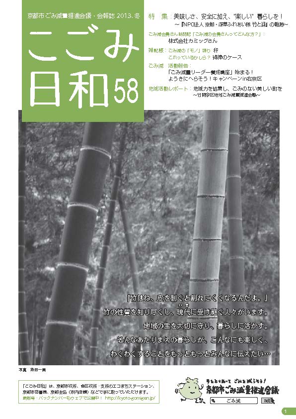 こごみ日和 60号(2014/夏)こごみ日和 60号(2014/夏)ができました!今号も,生活の中で,事業活動の中で,ごみ減量をはじめとした環境保全の活動をしているたくさんの団体さんをご紹介します。KBS京都 アナウンサー 海平和さんの連載は,あの池の素敵な秘密に迫ります!