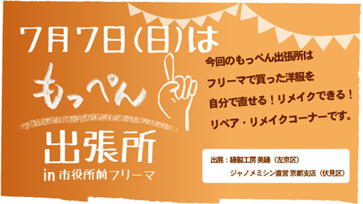 2013年7月7日(日)もっぺん出張所@市役所前フリーマを開催します!フリーマで買った服を自分好みになおしてみよう!