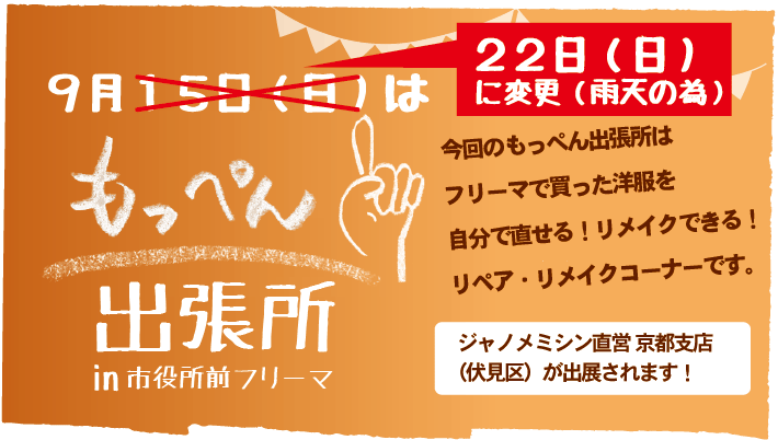 2013年9月22日(日)に順延)もっぺん出張所@市役所前フリーマを開催します!フリーマで買った服を自分好みになおしてみよう!