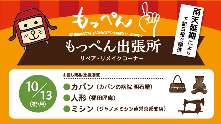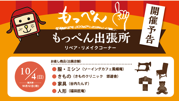 2015年10月4日(日)もっぺん出張所@市役所前フリーマを開催します!今回のもっぺん出張所では「ミシン,服」「きもの」「家具」「人形」のお直し屋さんが出展します☆