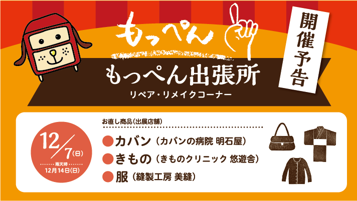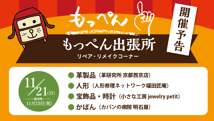 2015年11月21日(土)もっぺん出張所@市役所前フリーマを開催します!今回のもっぺん出張所では「革製品」「人形」「カバン」「宝飾品・時計」のお直し屋さんが出展します☆