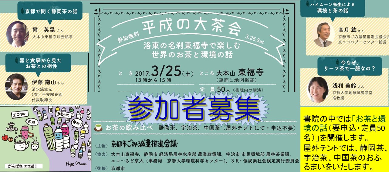 平成の大茶会 洛東の名刹東福寺で楽しむ世界のお茶と環境の話2017年3月5日(土)開催の「平成の大茶会 洛東の名刹東福寺で楽しむ世界のお茶と環境の話」のご案内です。