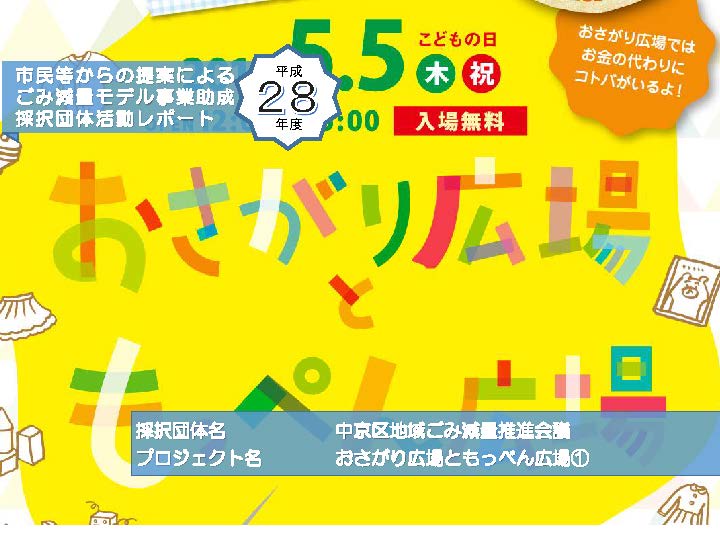 平成28年度:「中京区地域ごみ減量推進会議」:その2中京区地域ごみ減量推進会議の「おさがり広場ともっぺん広場」のレポート2回目。 たくさんの方でにぎわった、当日のイベントの様子です。[平成28年5月5日取材]