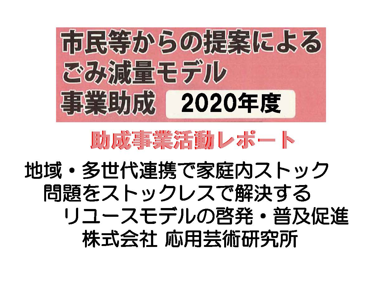 令和2年度:地域・多世代連帯で家庭内スタック問題をストックレスで解決するリユース・ドライブの開発RIGHT:[株式会社応用芸術研究所 令和2年12月10日取材]  応用芸術研究所(代表 片木孝治さん)は、家...